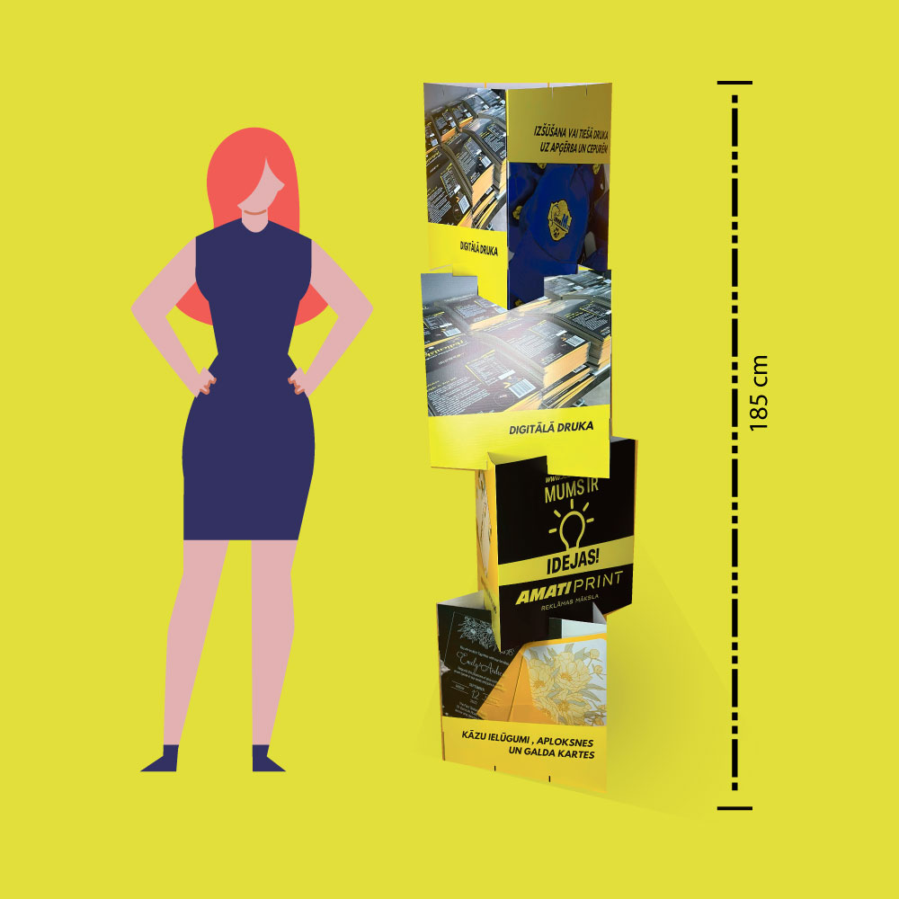 A new way to attract customer attention! Creative promotional stand made of cardboard. The triangular advertising display consists of four separate parts that easily transform, move and interlock. All four parts form an impressive 185 cm long column on top of each other. The sides can be freely adjusted: to your creativity and the information you want to deliver to your customers.
